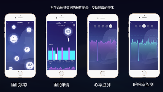 人躺在厚厚的床垫上,与传感器相隔50cm的距离,传感器依然可以监测和捕捉到人的每一次翻身、呼吸、心跳和打鼾的体征数据。