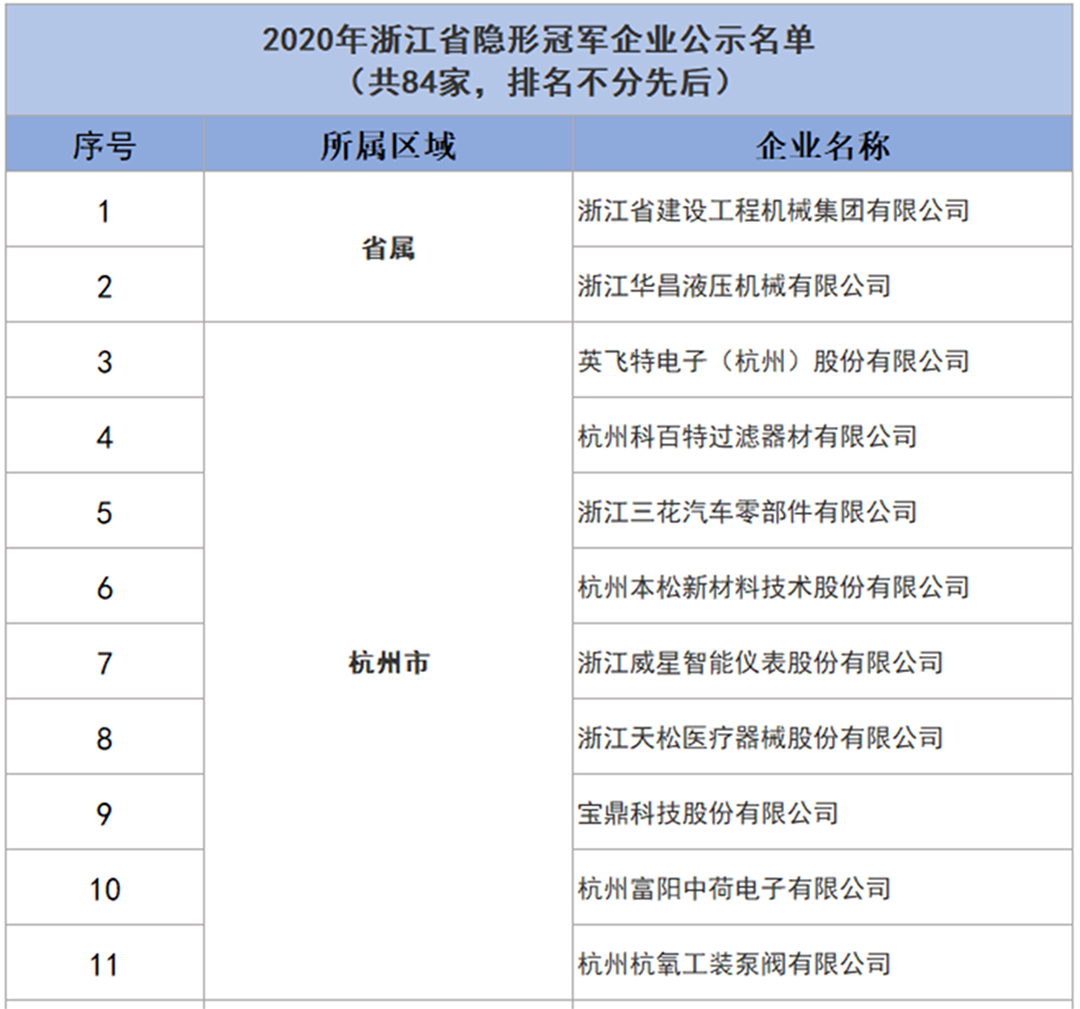 为贯彻落实《浙江省人民政府办公厅关于开展“雏鹰行动”培育隐形冠军企业的实施意见》(浙政办发﹝2019﹞28号),凭据省经信厅《关于组织2020年隐形冠军及培育企业申报事情的通知》要求,经企业自愿申报,各县市经信部门初审推荐,省经信厅组织形式审查和专家评审,经研究拟确定2020年浙江省隐形冠军企业名单,现予以公示。